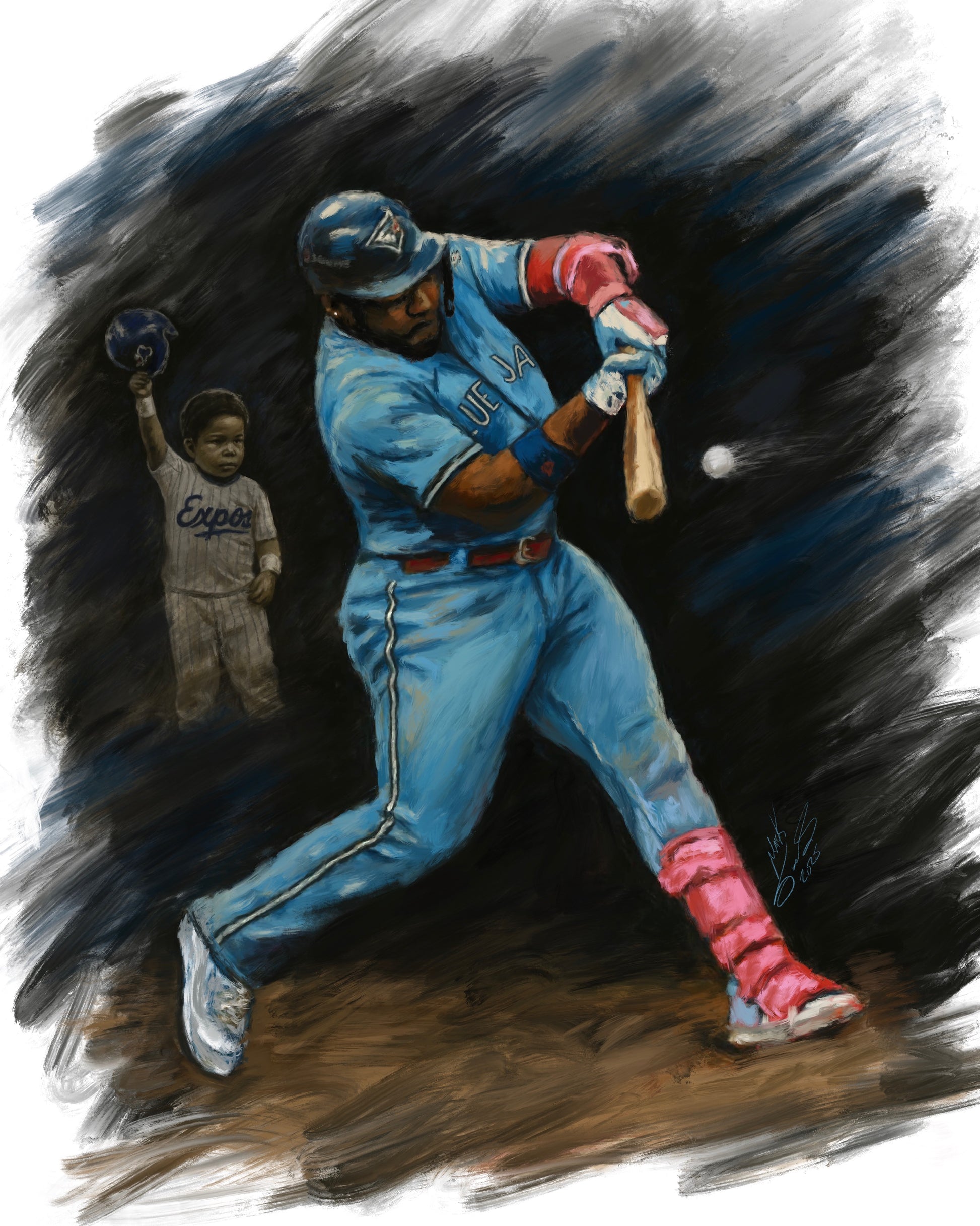 Painted with expressive brushwork and emotion, the artwork portrays Guerrero Jr. mid-swing — confident, fierce, and focused — while a young version of himself, wearing an old Expos uniform, stands behind him, a nod to his roots and the journey that shaped him.