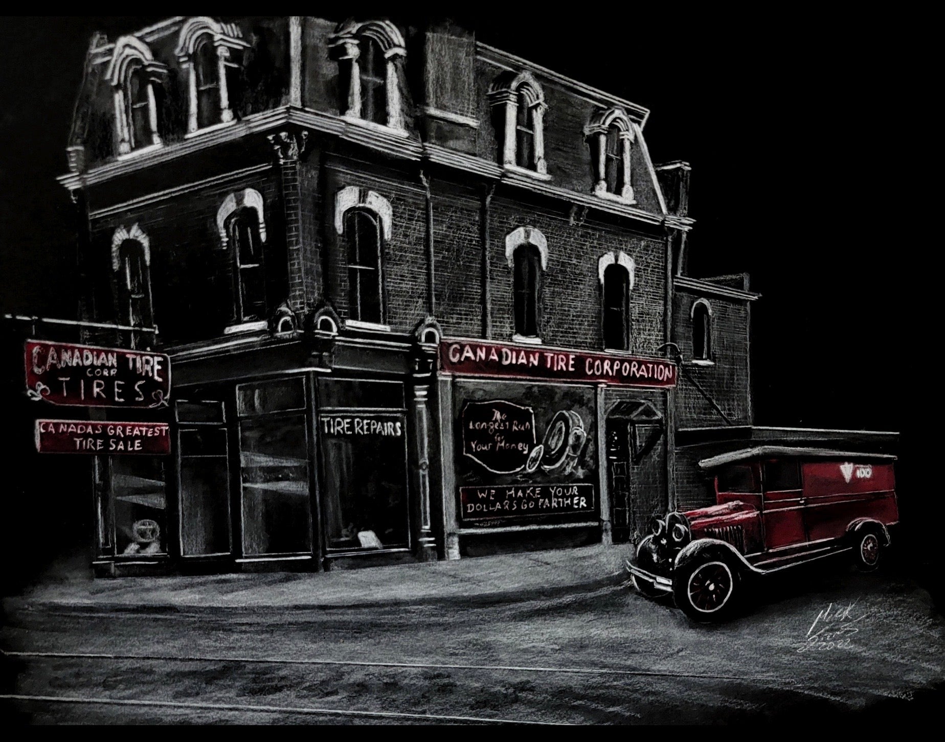 Created in celebration of Canadian Tire’s 100th anniversary, this piece is a tribute to one of Canada’s most beloved and enduring institutions. Rendered in white charcoal and red pastel, it captures the essence of a bygone era — when service, craftsmanship, and community stood at the heart of every local shop.