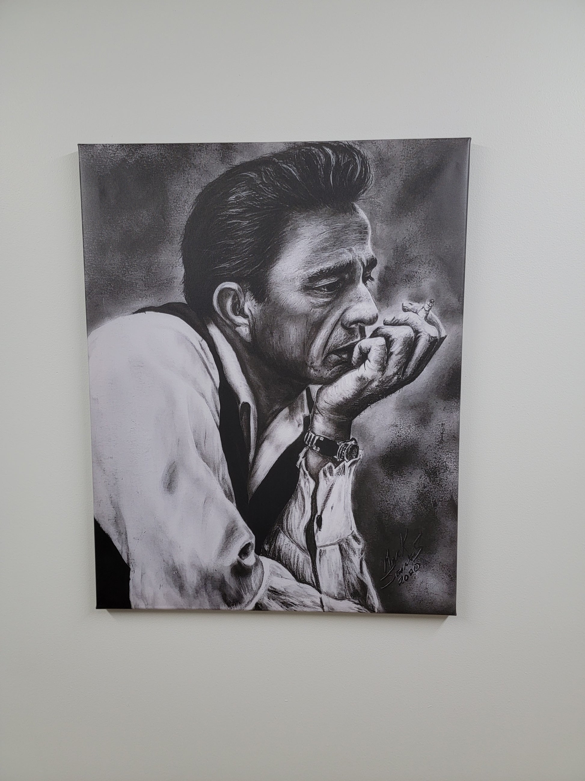This powerful charcoal portrait captures the legendary Johnny Cash in a rare moment of deep reflection. The piece evokes the raw soul and weathered wisdom of a man who lived through every lyric he sang.