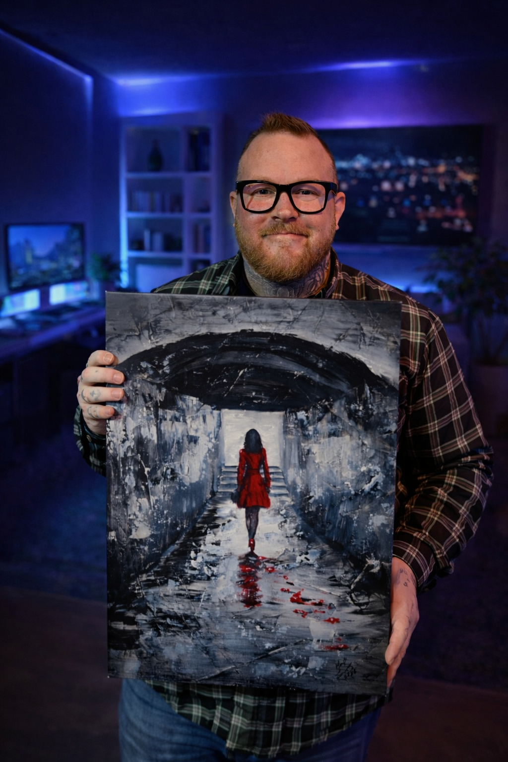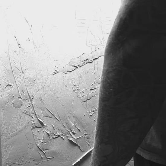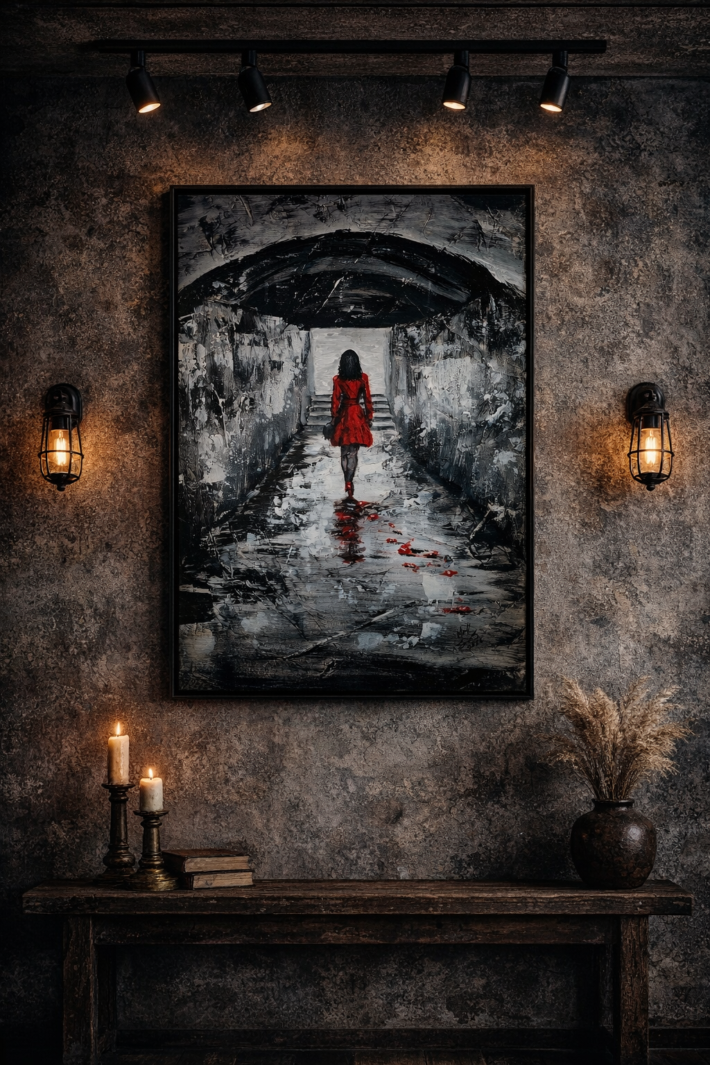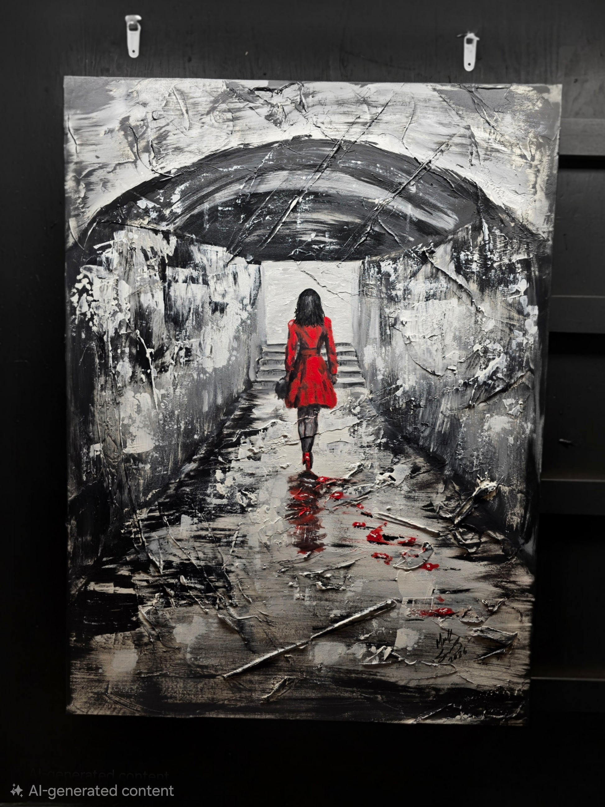 Inspired by a recent trip to Venice, No Turning Back captures a powerful moment of movement and transformation. The dramatic contrast of black, white, and grey is anchored by a bold figure in red, symbolizing strength, resolve, and forward momentum.
