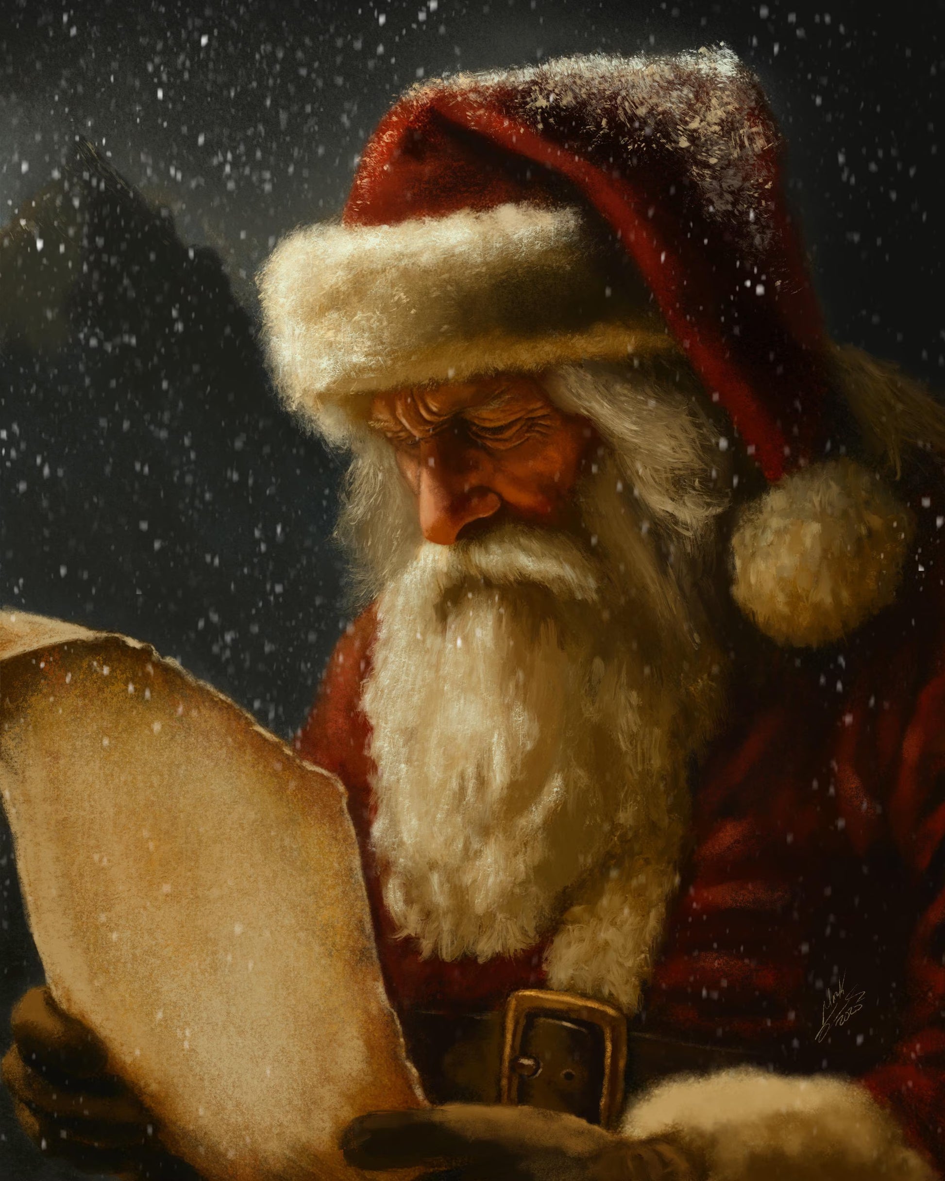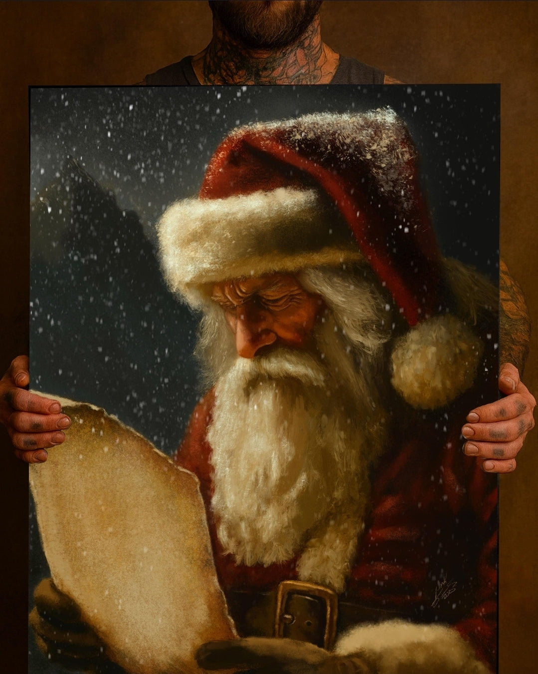 Step into the heart of Christmas with “The List,†a captivating pastel and acrylic painting that captures Santa in a rare, intimate moment — checking his famous list by warm candlelight.